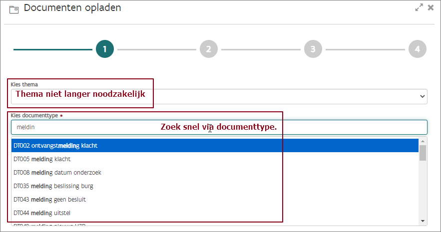 • Sinds de release van 04/21 is het niet langer nodig om voorafgaandelijk een thema te selecteren.  U kunt vanaf nu zoeken over alle thema's heen op (een deel) van het documenttype om het snel terug te vinden.