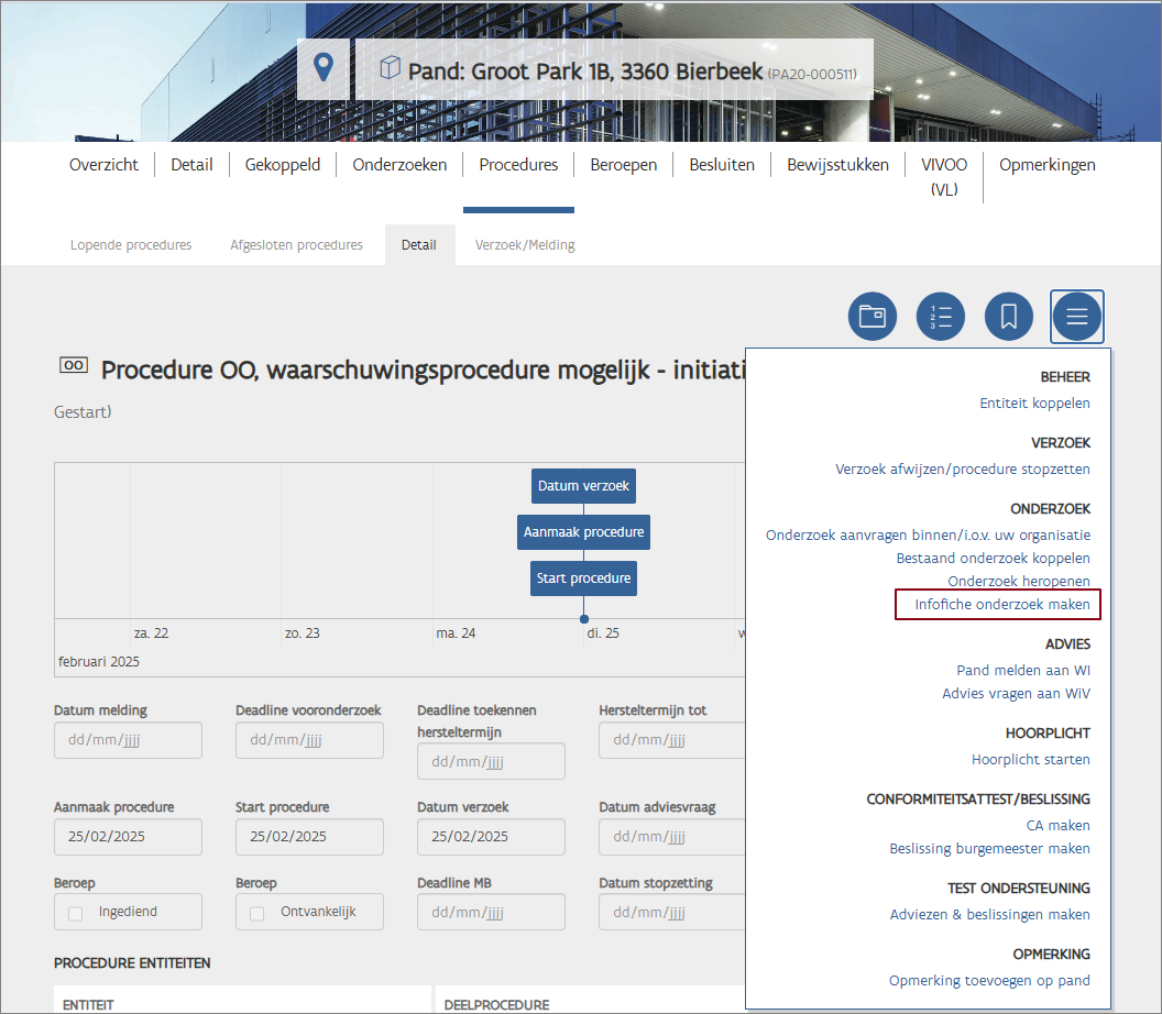 Vanaf de release van 28 april 2025 kunt u in een procedure OO een infofiche maken op basis van een onderzoek ter ondersteuning van de beslissing van de burgemeester.
