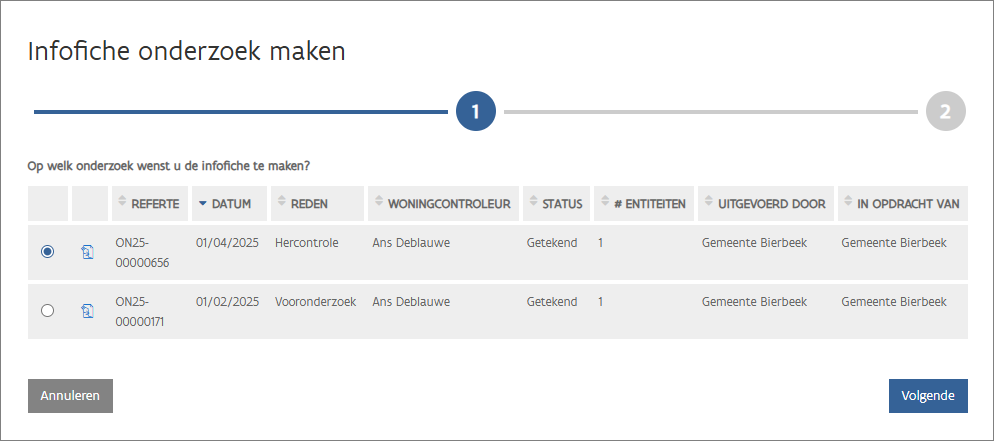Selecteer het onderzoek waarop u de infofiche wil baseren.