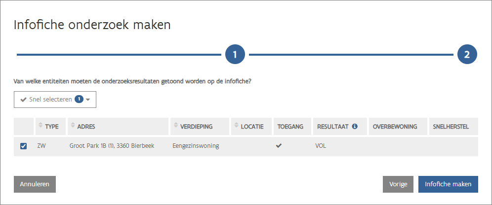 Selecteer de entiteiten Een entiteit is een deel van een pand. Er zijn 3 entiteitstypes: niet-woonfunctie (NWF), een niet-zelfstandige woning (NZW) en een zelfstandige woning (ZW). Zie voor uitgebreide definitie' Hoe voeg ik een nieuwe entiteit toe?' waarvan u de info uit het onderzoek wil opnemen op de infofiche en klik op Infofiche maken