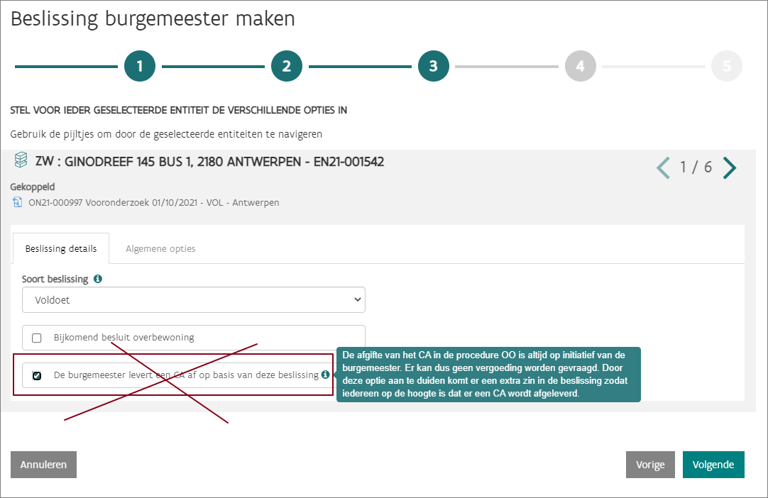 Omdat art. 3.6 VCW sinds 9/6/23 bepaalt dat de burgemeester ambtshalve een CA aflevert indien de woning conform is, kunt u sinds de release van 16/10/23 zelf niet langer aanvinken of u al dan niet een CA wilt afleveren.