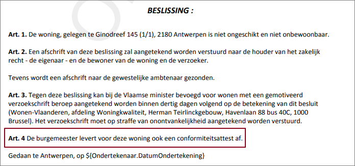 Indien geen herstelvordering op de entiteit rust en de entiteit niet is gemarkeerd als onvergunde domiciliekamer, voegt VLOK aan het document van de beslissing voldoet automatisch art. 4 toe om te melden dat de burgemeester voor deze woning ook een conformiteitsattest Wie een woning in Vlaanderen verhuurt, moet ervoor zorgen dat deze volledig in orde is en voldoet aan bepaalde normen. Het conformiteitsattest (CA) is een officieel document dat de gemeente aflevert en dat aantoont dat uw woning aan de woningkwaliteitsnormen voldoet. In sommige gevallen kan ook Wonen in Vlaanderen een conformiteitsattest afleveren. Om na te gaan of een woning conform, veilig en gezond is, voert een woningcontroleur van de gemeente of van Wonen in Vlaanderen een conformiteitsonderzoek uit. Hij controleert de woning aan de hand van een technisch verslag.De woning krijgt een conformiteitsattest als ze niet ongeschikt of onbewoonbaar is en voldoende rookmelders heeft. aflevert.