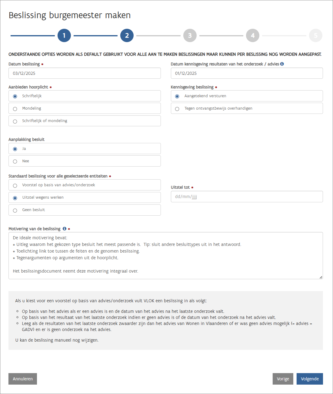 - U kunt zelf een standaardbeslissing 'Uitstel wegens werken' of 'Geen besluit' selecteren die VLOK zal toepassen op alle beslissingen. Geef de datum uitstel op.