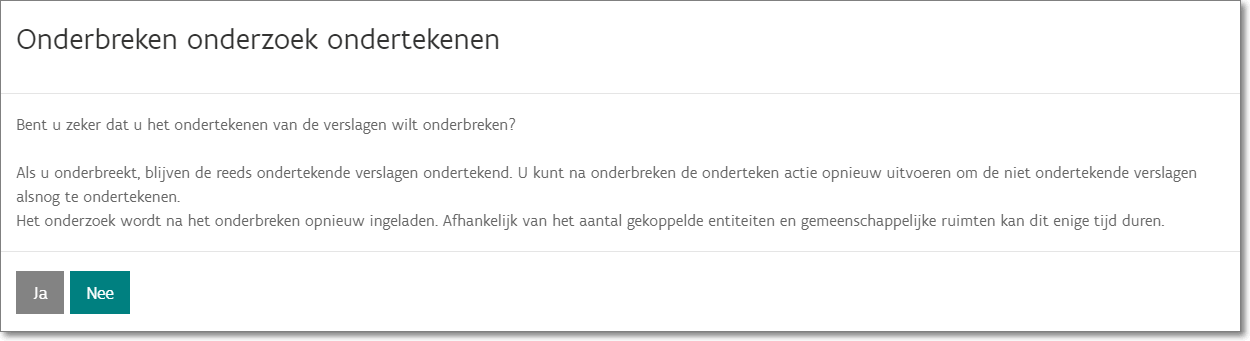 De controles of het volledige onderzoek is ondertekend en indien niet, wie nog moet ondertekenen, gebeurt evenals het inladen van het onderzoek na ondertekening in dezelfde pop-up zodat u na het sluiten een actueel overzicht krijgt van het onderzoek en de ondertekenactie opnieuw kunt uitvoeren voor nog niet ondertekende verslagen.