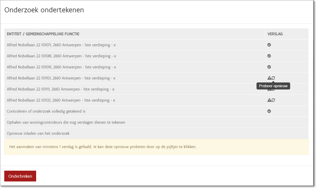 Een onderzoek krijgt pas de status ‘Getekend’ indien alle woningcontroleurs aangeduid in het onderzoek hebben getekend.