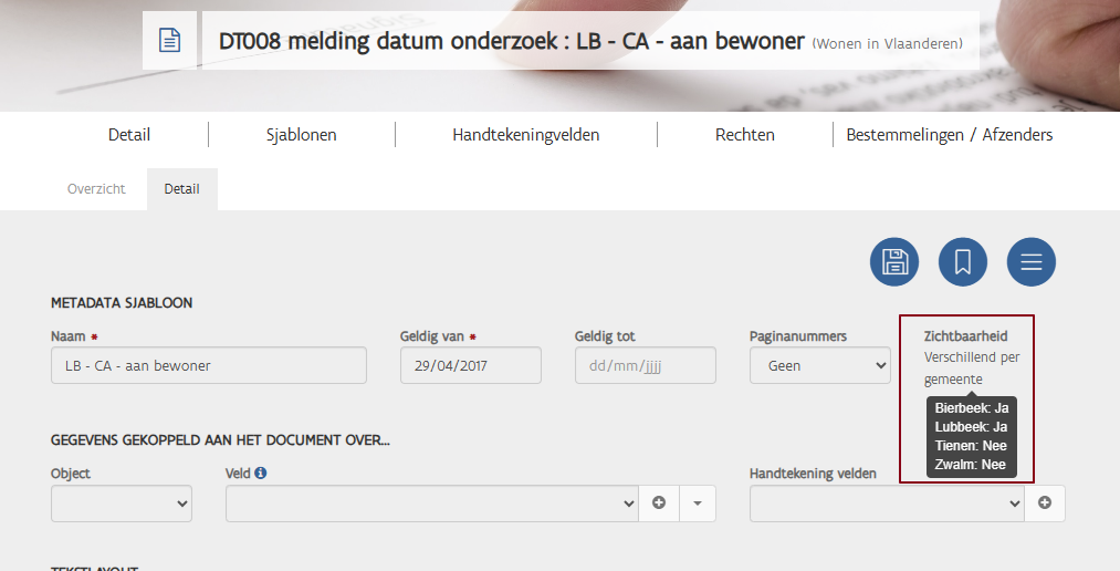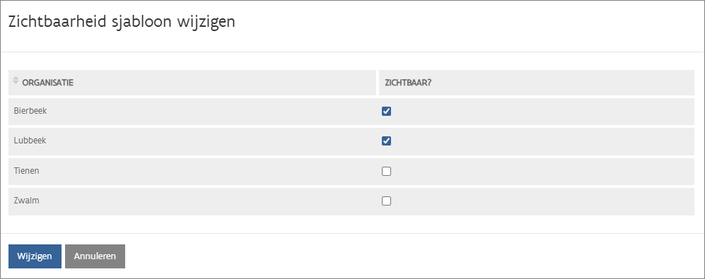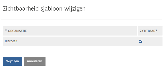 Vink aan / af of het sjabloon al dan niet zichtbaar moet zijn voor een specifieke gemeente en klik op Wijzigen.