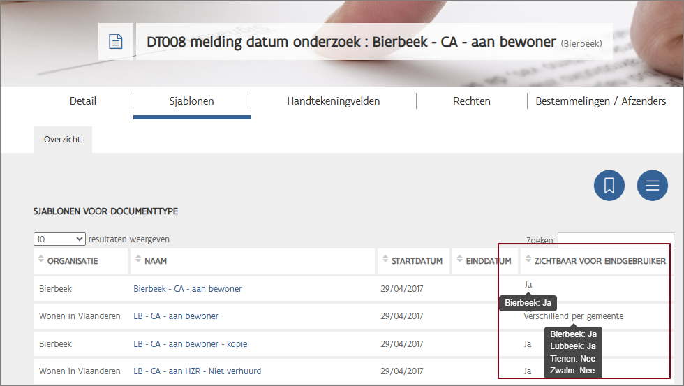 De zichtbaarheid van standaardsjablonen aangemaakt door Wonen in Vlaanderen voor gemeenten kunt u wijzigen voor alle gemeenten waar u toepassingsbeheerder bent. De naam van de sjablonen aangemaakt door Wonen in Vlaanderen voor lokale besturen starten met LB.