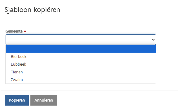 Als u toepassingsbeheerder bent voor meerdere gemeenten, selecteert u de gemeente waarvoor u het sjabloon wenst te kopiëren klik op Kopiëren en bevestig vervolgens via Ja