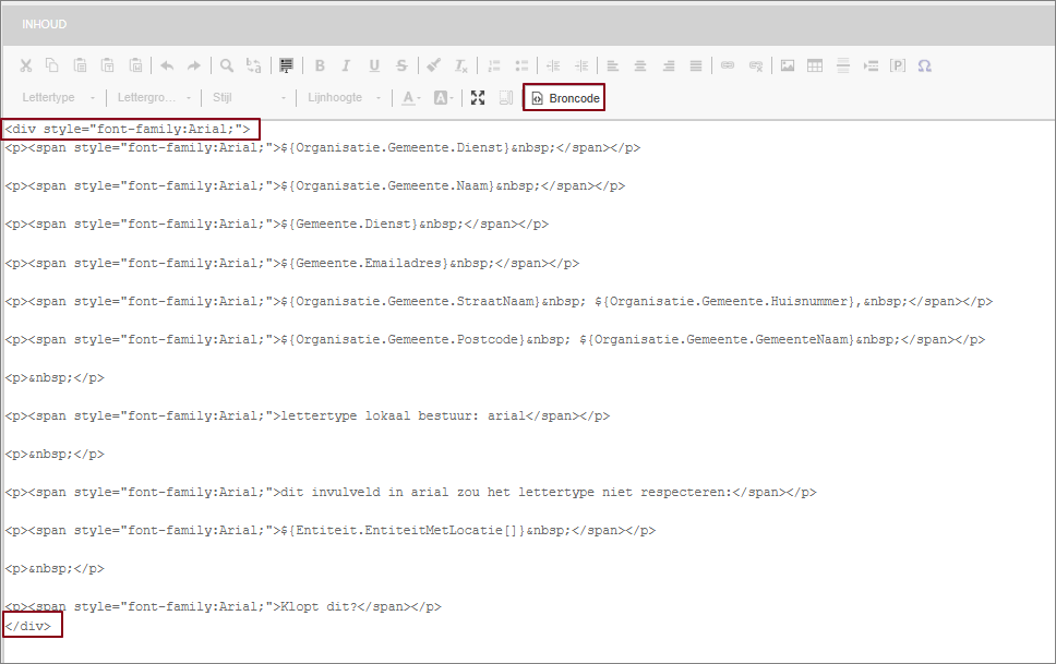 Via de broncode kunt u de html versie van het sjabloon / document bewerken. Zo kunt u bijvoorbeeld eens u een standaardsjabloon hebt aangemaakt voor uw organisatie, dit eenvoudig kopiëren naar andere sjablonen via de broncode. U hoeft enkel nog de inhoudelijk tekst aan te passen.