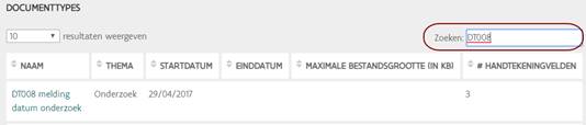 U kunt DT’s snel terugvinden via de filter rechts boven de tabel waar u kan zoeken op de naam van het DT.