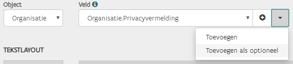 Als u een invulveld toevoegt aan een sjabloon kunt u kiezen via de pijl naast de + om het toe te voegen als standaard of optioneel. U kunt bestaande standaardinvulvelden in sjablonen eenvoudig omzetten naar optionele door het $ te vervangen door een #.