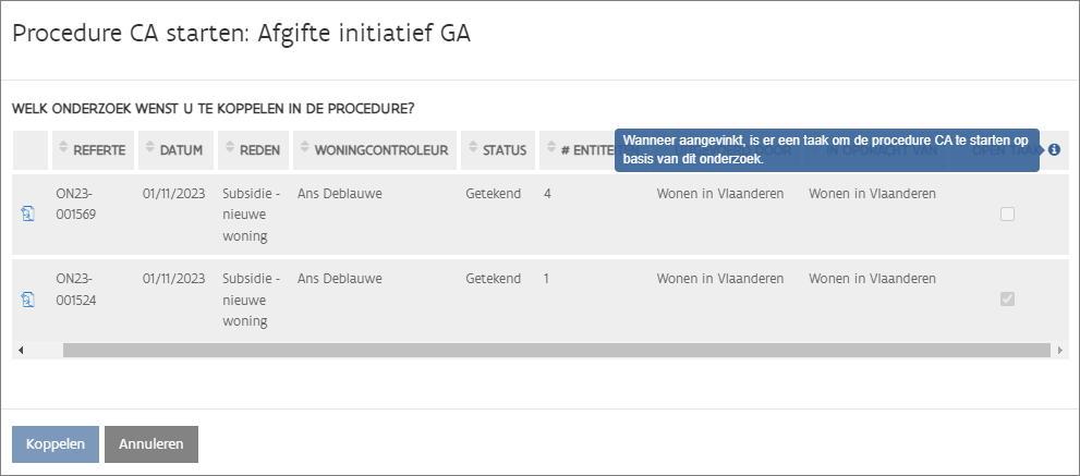 In de kolom 'Open taak' geeft VLOK aan of bij het ondertekenen van het onderzoek een taak is aangemaakt voor het opstarten van een procedure CA: