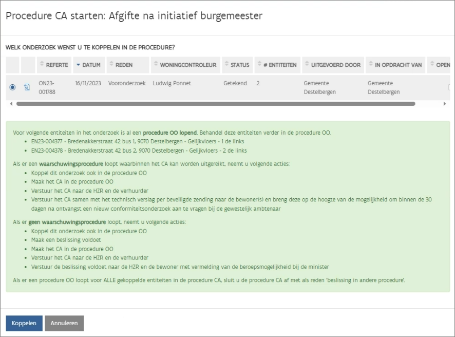 Indien een CA mogelijk is voor een entiteit Een entiteit is een deel van een pand. Er zijn 3 entiteitstypes: niet-woonfunctie (NWF), een niet-zelfstandige woning (NZW) en een zelfstandige woning (ZW). Zie voor uitgebreide definitie' Hoe voeg ik een nieuwe entiteit toe?' waarvoor reeds een procedure OO lopende is, zal VLOK de gemeente informeren om het CA aan te maken via de procedure OO.