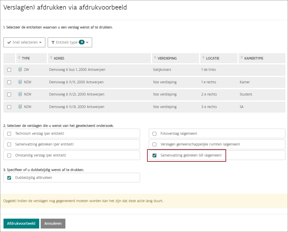 U kunt één of meerdere soorten verslagen over verschillende entiteiten Een entiteit is een deel van een pand. Er zijn 3 entiteitstypes: niet-woonfunctie (NWF), een niet-zelfstandige woning (NZW) en een zelfstandige woning (ZW). Zie voor uitgebreide definitie' Hoe voeg ik een nieuwe entiteit toe?' heen groeperen in één bestand om het snel te mailen of af te drukken.