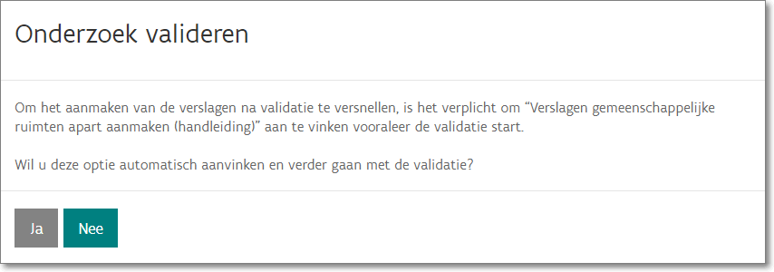 - Om te vermijden dat u na een positieve validatie van een groot onderzoek de validatie opnieuw moet uitvoeren omdat u vergeten zou zijn het vinkje aan te vinken, zal VLOK voor onderzoeken met meer dan 5 gemeenschappelijke ruimten het vinkje automatisch aanvinken. VLOK brengt u op de hoogte met volgende melding: