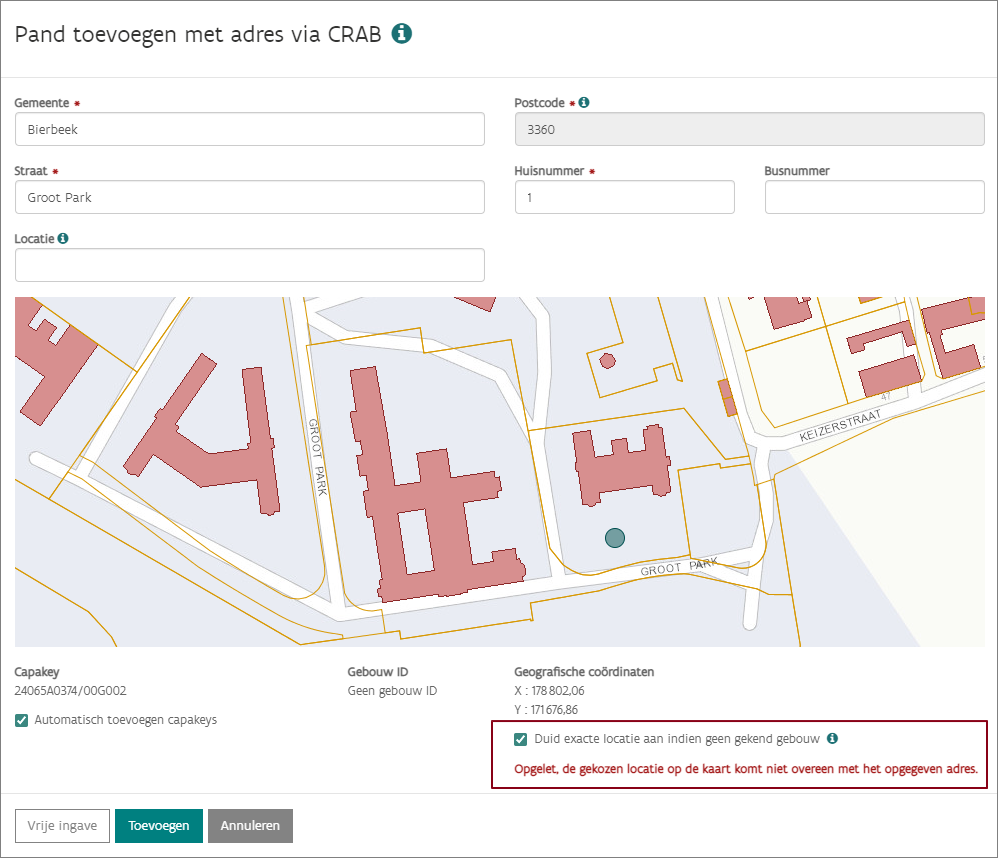 Als u in uitzonderlijke gevallen een locatie wilt aanduiden die niet overeenkomt met een gebouw, kunt u na aanvinken onder de geografische coördinaten de exacte locatie op de kaart aangeven. Dit is bijvoorbeeld nuttig voor bepaalde onderzoeken door de Vlaamse Wooninspectie De Vlaamse Wooninspectie is onderdeel van de dienst Handhaving van het agentschap Wonen in Vlaanderen. De Vlaamse wooninspectie zorgt voor de strafrechtelijke handhaving van de woningkwaliteit. Zij treedt op tegen het verhuren van woningen met ernstige kwaliteitsproblemen, rekening houdend met vastgestelde prioriteiten..