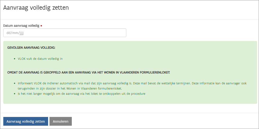 Na de registratie van een aanvraag en het eventueel ontvangen van extra informatie en/of de betaling, kunt u aangeven dat de aanvraag volledig is. Indien een aanvraag uit het formulierenloket is gekoppeld ontvangt de indiener automatische communicatie. De wettelijke termijnen starten vanaf de datum volledigheid.