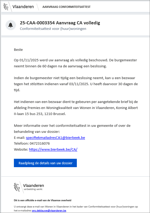 De indiener ontvangt wel automatisch een mail dat zijn aanvraag volledig is. Deze mail bevat de wettelijke termijnen.