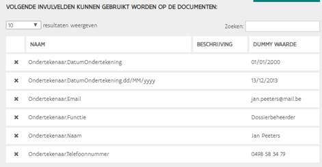 Meervoudige invulvelden: Voor meervoudige koppelingen is het mogelijk om lijsten weer te geven. De hiervoor gebruikte syntax is [] bv. ${Entiteit[]} geeft een lijst met alle geselecteerde entiteiten.