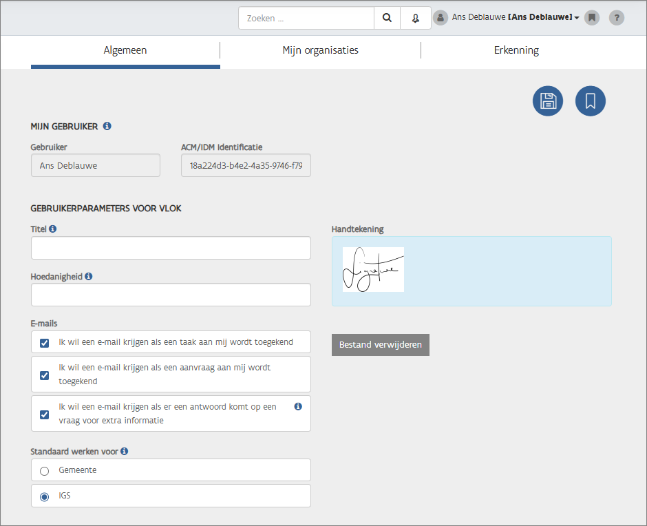 Het ACM/IDM mail adres en telefoonnummer kunt u niet wijzigen. VLOK ontvangt ze rechtstreeks van de applicatie toegangsbeheer. Ze dienen als back-up voor het geval de gebruiker zelf geen gegevens heeft opgegeven. Het is de lokale beheerder van uw organisatie die de rollen, het e-mailadres en telefoonnummer kan aanpassen in het toegangsbeheer. Zie STAP 3b: Toegang verlenen (lokale beheerder)