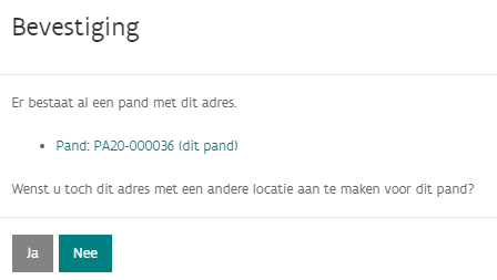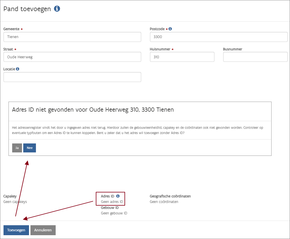 Om typefouten te voorkomen, moet u expliciet bevestigen dat u het adres wilt bewaren zonder adresID. Controleer zorgvuldig of u alsnog geen adresID vindt door eventuele typefouten te corrigeren.