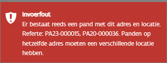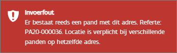 | Waarschuwing op uniekheid pand | Controle op adres | 1/ Waarschuwing van hetzelfde adres![]() 2/ Locatie veld is leeg (nochtans verplicht wanneer 2 identieke adressen) ![]() 3/ Locatie is hetzelfde ![]() |