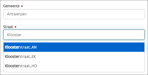 de straat. Als een zelfde straat meerdere keren voorkomt in een hoofdgemeente, kunt u op basis van de afkorting van de deelgemeente de correcte straat selecteren.