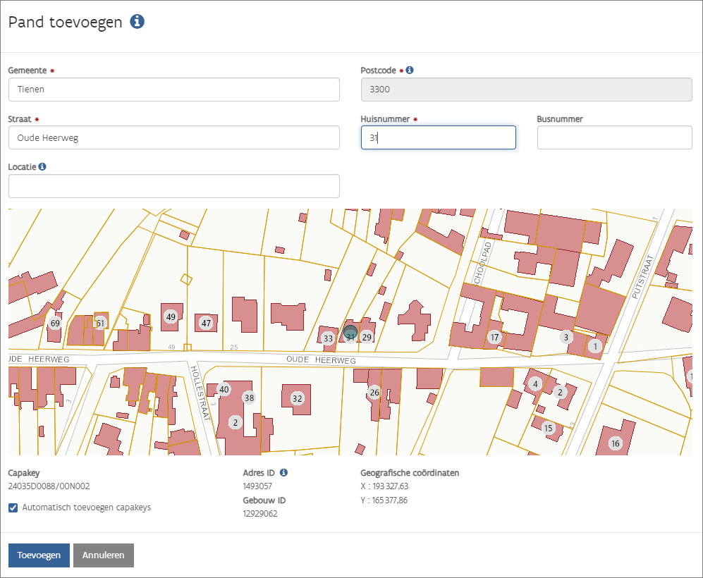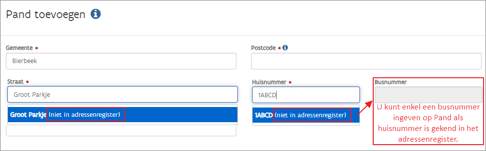 Om fouten te vermijden is nu verduidelijkt tussen haakjes in de zoekresultaten dat het resultaat niet gevonden is in het adresregister. Op een pand kunt u enkel nog een busnummer ingeven indien het huisnummer is gekend in het adressenregister.
