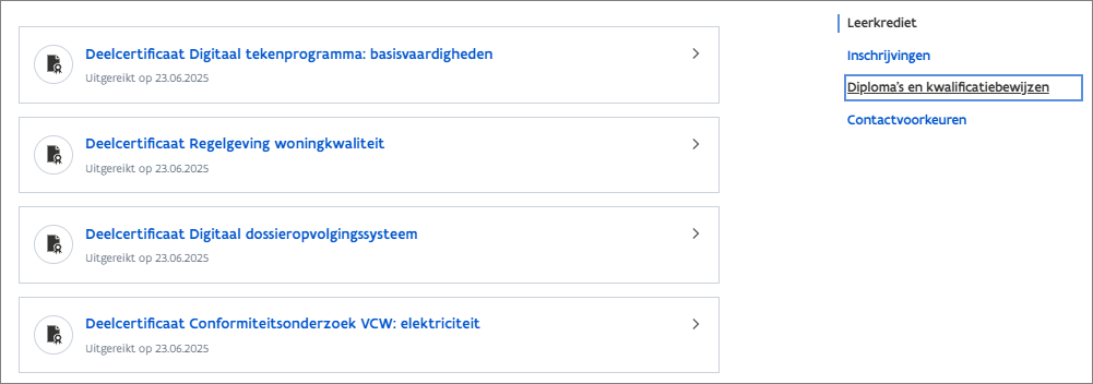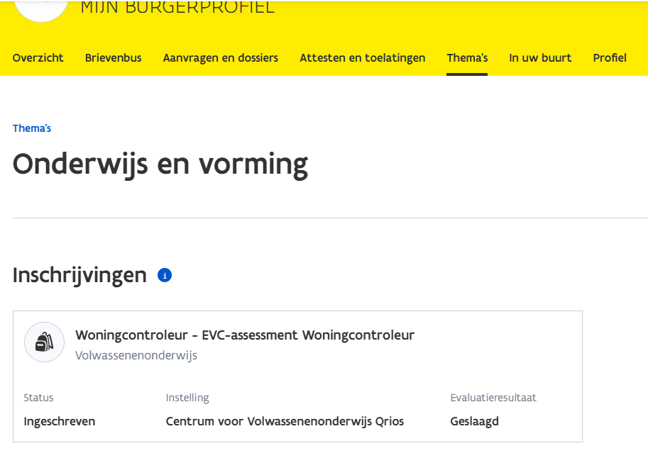 De woningcontroleur kan via Mijn burgerprofiel > Thema's > Onderwijs en vorming checken of het bewijs al is opgeladen door de onderwijsinstelling:
