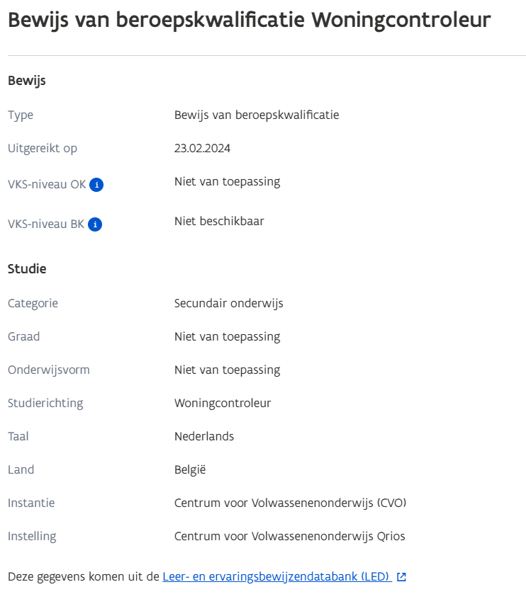 VLOK checkt elke avond via de leer- en ervaringsbewijzendatabank (LED) of de woningcontroleur een bewijs van beroepskwalificatie heeft via de taak ErkenningenValiderenBeroepskwalificatie