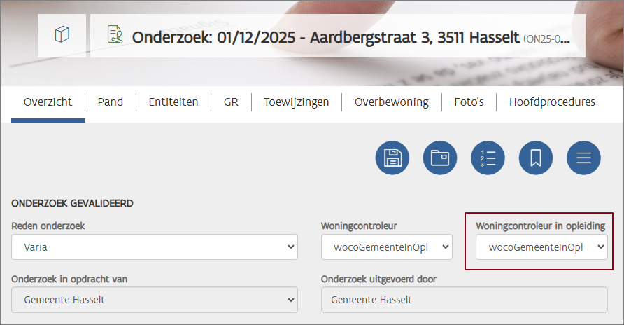 Vanaf 1/1/26 bevatten alle onderzoeken op de tab Overzicht een nieuw veld Woningcontroleur in opleiding.