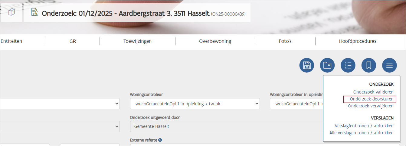 De woningcontroleur kan de opdrachtgevende organisatie later nog wijzigen via Onderzoek > Overzicht.