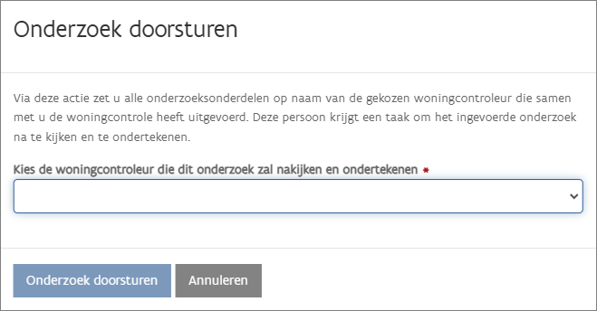 Omdat een woningcontroleur in opleiding niet zelf kan ondertekenen, kan hij via deze actie het onderzoeken doorsturen ter ondertekening naar een erkend woningcontroleur.