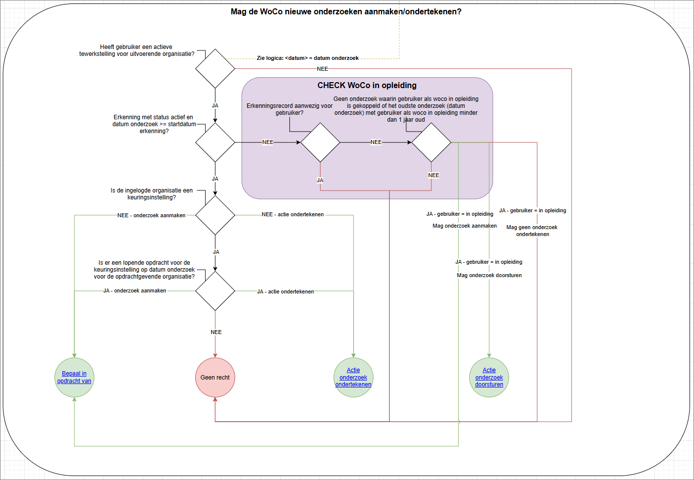 Flow schema voor actieve tewerkstelling, aanmelden en aanmaken/ondertekenen van onderzoeken