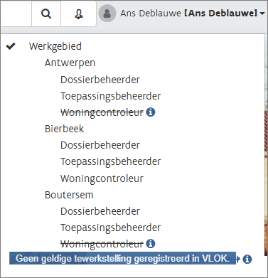 Als u aanmeldt als woningcontroleur zonder actieve erkenning of actieve tewerkstelling, zal VLOK de rol woningcontroleur verwijderen (doorstrepen) zodat u de rechten van de rol woningcontroleur niet kunt uitvoeren.