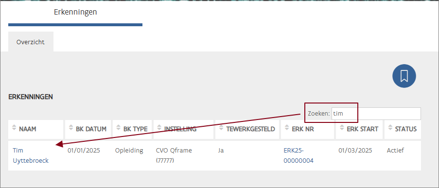 Klik op de woningcontroleur van wie u de erkenning wil beheren.