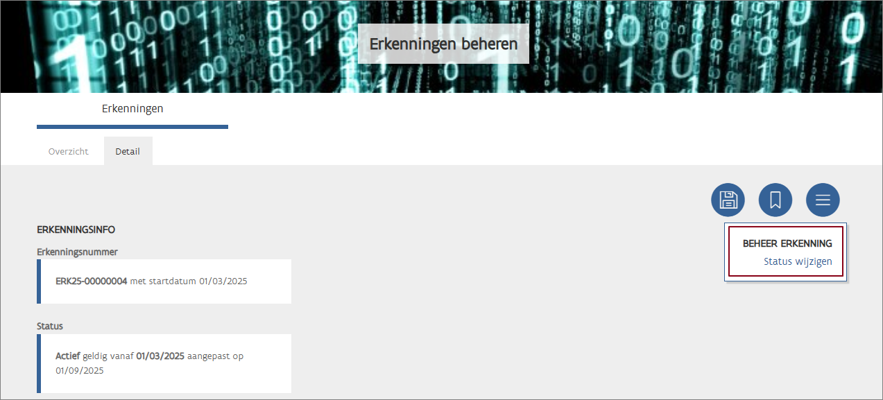 Klik op de actie Status wijzigen via op Erkenningen > Detail