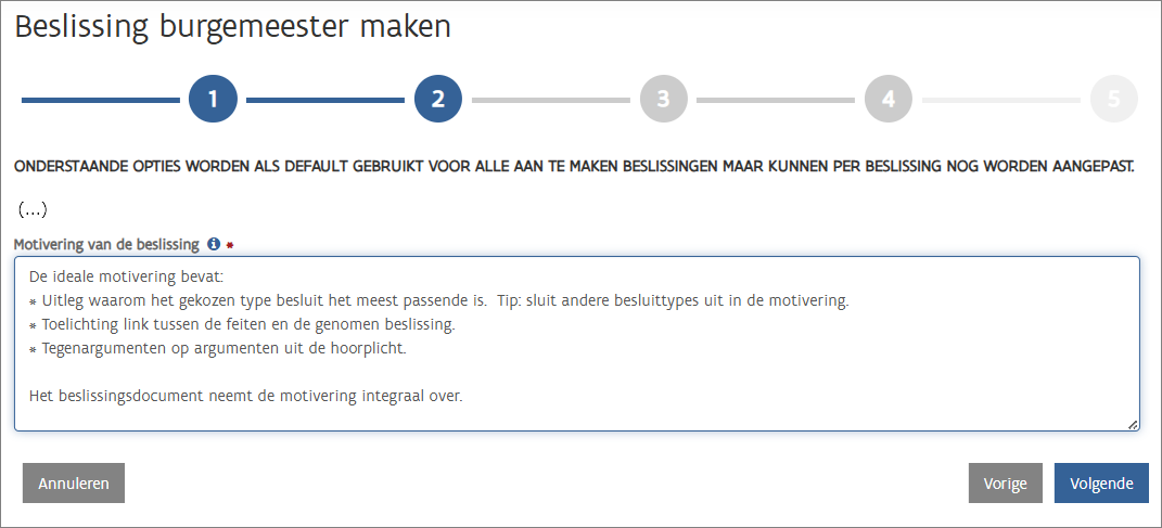 Vul de standaard parameters in voor de beslissing(en). U kunt deze parameters per individuele beslissing nog wijzigen in stap 3.