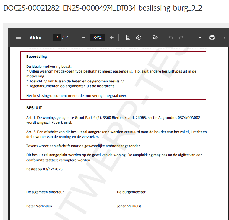 Als de burgemeester of algemeen directeur de beslissing weigert te ondertekenen, moet u opnieuw de beslissingen aanmaken en kunt u eventueel het onderzoek heropenen.