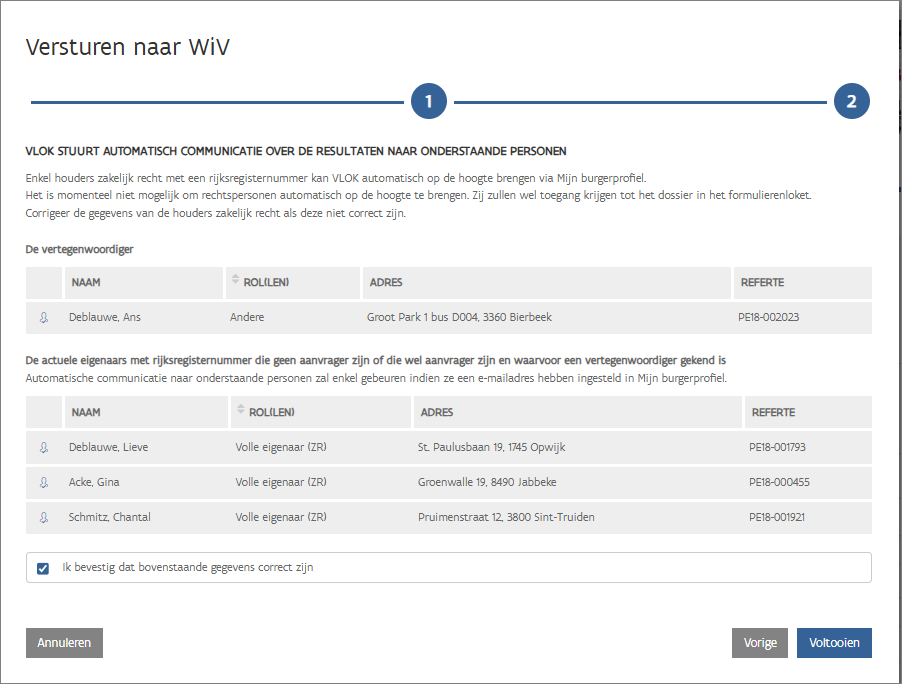 Stap 2 is enkel zichtbaar indien een aanvraag uit het formulierenloket is gekoppeld in de procedure CA. VLOK informeert wie een automatische kennisgevingsmail zal ontvangen.