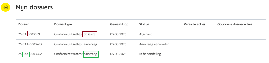 Een dossier (slechts 1 entiteit) herkent u aan CA in de referte