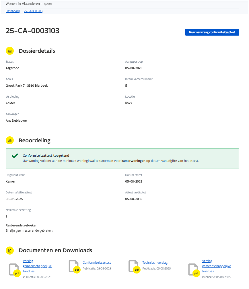 Voor de kamerwoningen worden enkel de conformiteitsattesten en weigeringsbrieven via mail verstuurd. De bijhorende technische verslagen moet u in Vlok downloaden en zelf bezorgen aan de WM. -
