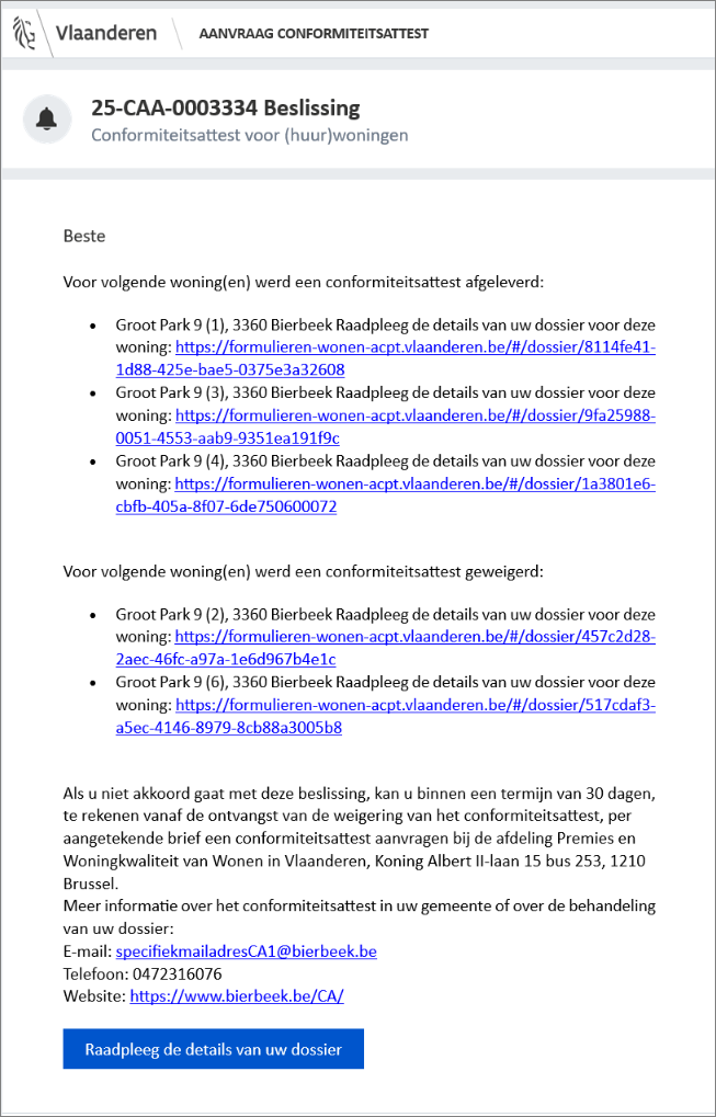 Klik op het dossier voor een detail van het dossier met een overzicht van de genomen beslissing. Voorbeelden: