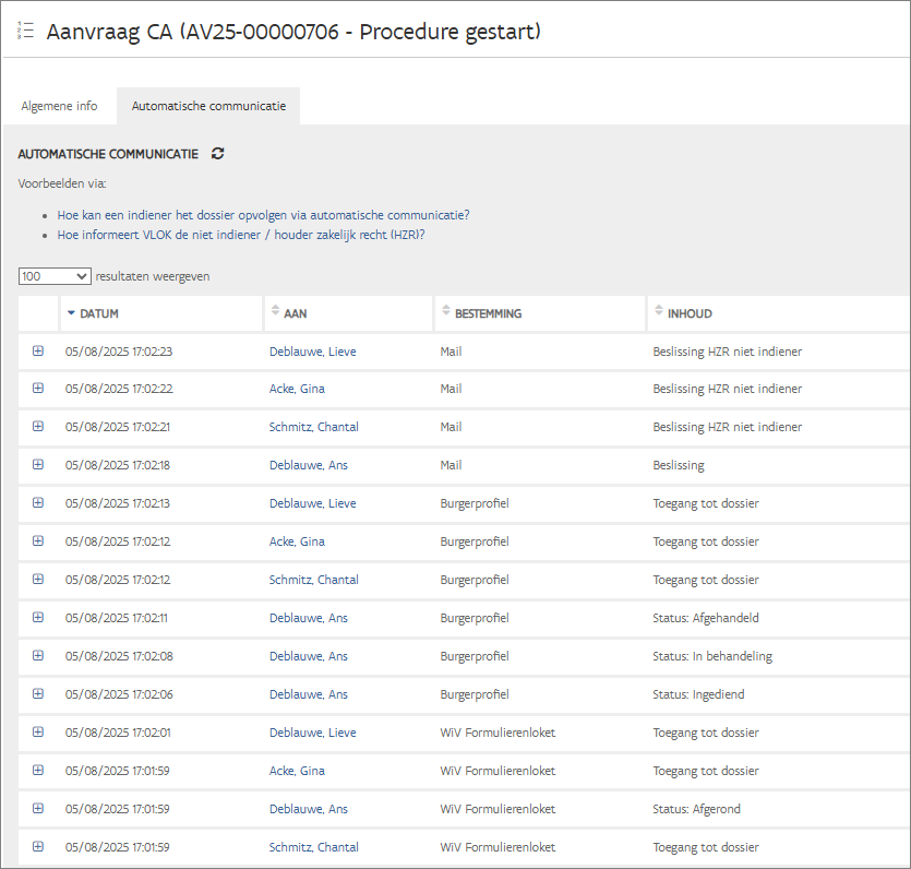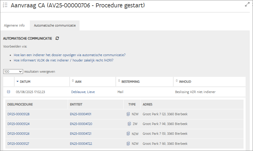 Het opsplitsen in dossiers kunt u erkennen aan + in VLOK > Automatische communicatie: