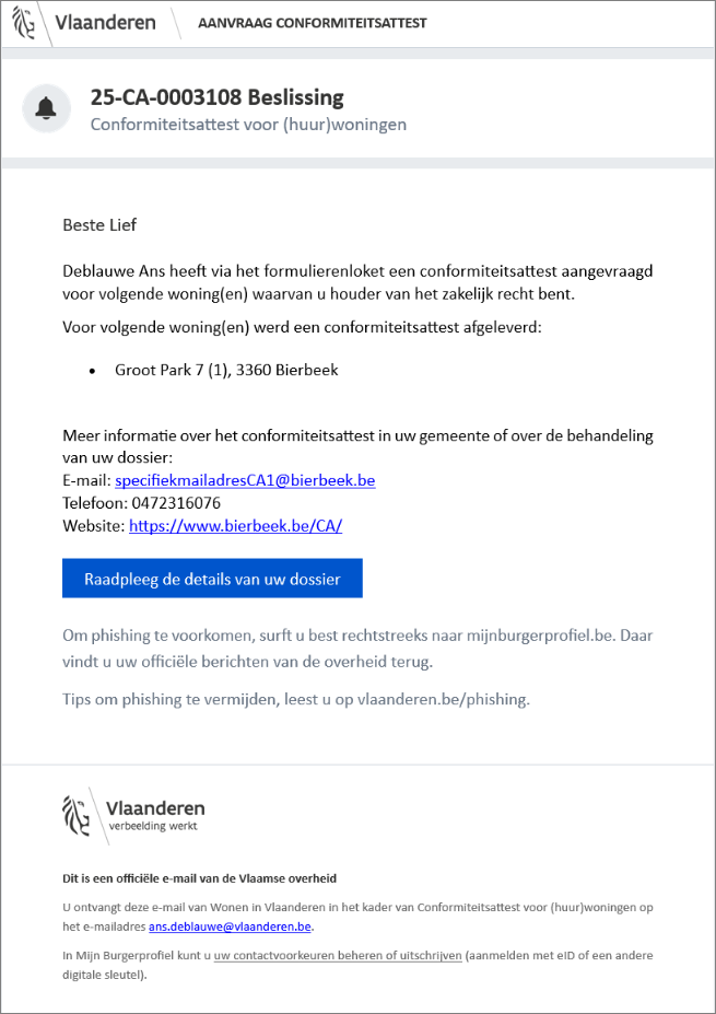 162 kennisgeving CA aan eigenaar/verhuurder toegekend aan de dossierbeheerder (gemeente)