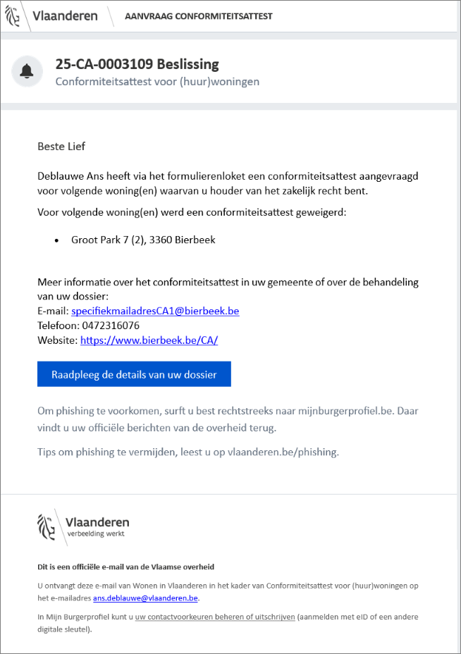 <indien reden weigering = OG Ongeschikt. Dit is een mogelijk resultaat voor een entiteit in een onderzoek, advies of beslissing van de burgemeester. of OG/OB Ongeschikt en onbewoonbaar. Dit is een mogelijk resultaat voor een entiteit in een onderzoek, advies of beslissing van de burgemeester.>Op basis van het onderzoek <referte onderzoek als link> van <datum onderzoek> werd het CA geweigerd voor <adres entiteit - verdieping - locatie> met reden <reden weigering>. Via de referte kan u het onderzoek bekijken als u toegang heeft tot VLOK.