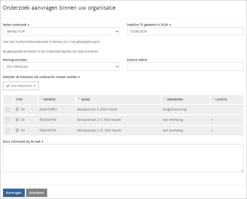 Extra informatie is een vrij invulveld om te verduidelijken welke woningen moeten onderzocht worden. Als u geen entiteiten selecteert is het verplicht.
